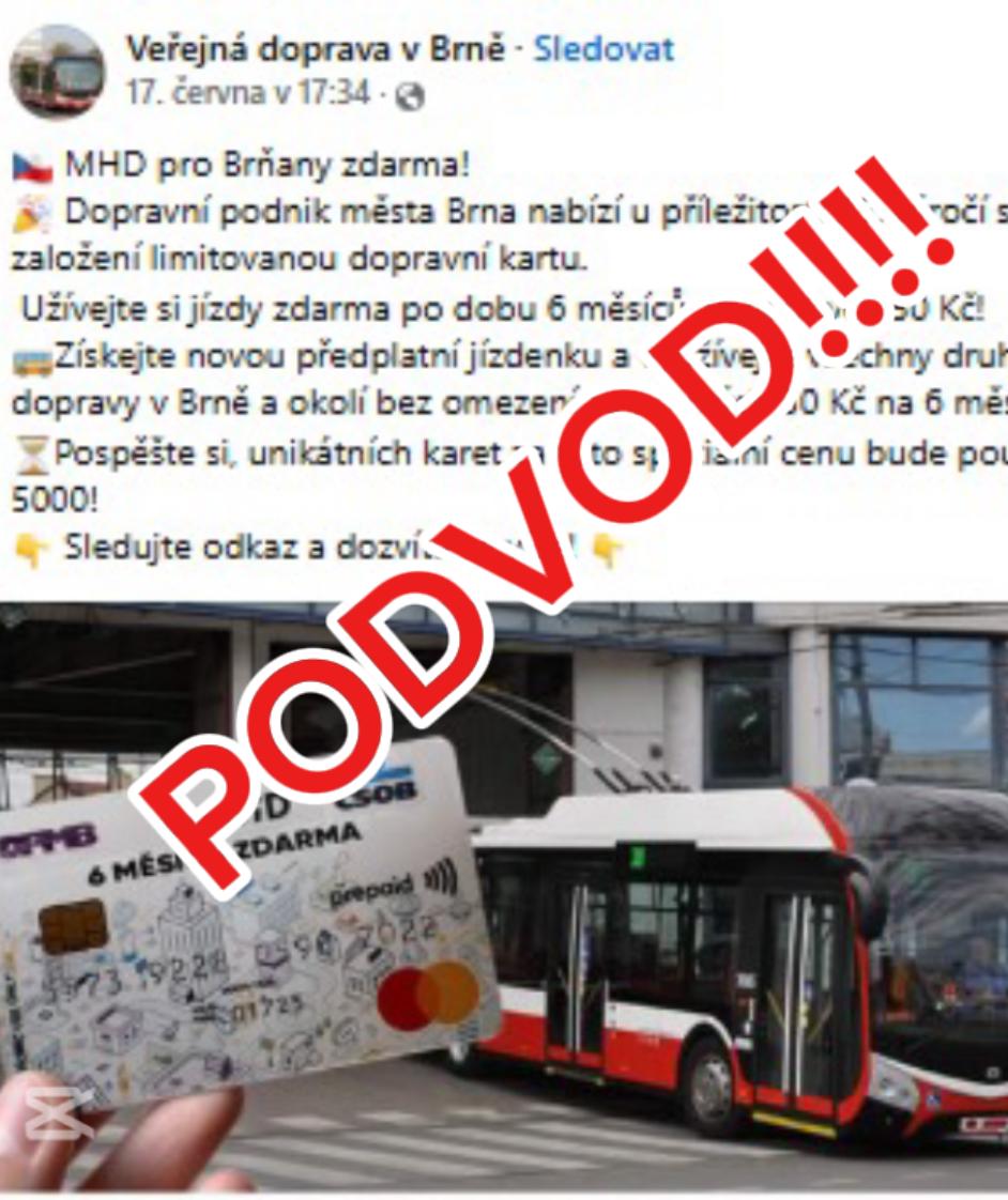 V uplynulých dnech jste na sociálních sítích mohli zaznamenat příspěvek, který informuje o možnosti zřízení dopravní karty na šest měsíců za 50 Kč. Tato informace není pravdivá! Z bezpečnostních důvodů doporučujeme odkaz neotevírat ani jej nesdílet! Děkujeme.