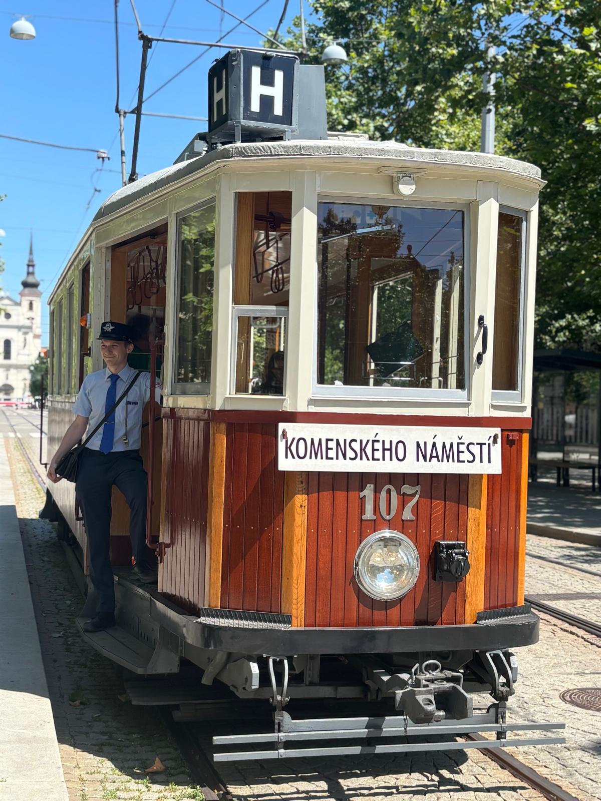 Dvounápravový motorový vůz číslo 107 z roku 1943 jezdí v nepracovní dny na trase Komenského náměstí – Česká – Náměstí Svobody – Zelný trh – Hlavní nádraží – Nové sady – Hybešova – Václavská – Mendlovo náměstí. Linka je v provozu do konce září 2025. Platí na ní běžný tarif IDS JMK, pouze není dovolena přeprava jízdních kol a nadměrných zavazadel. Jízdní řád je ke stažení na webových stránkách www.dpmb.cz.